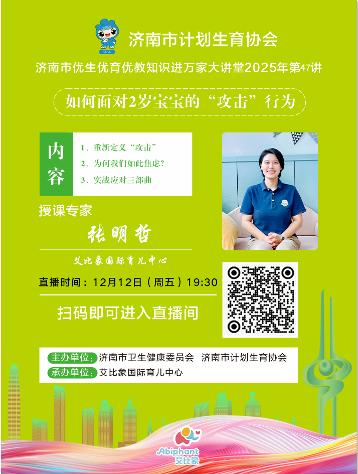 12月12日(周五)19:30,济南市卫生健康委、计生协优生优育优教知识进万家2025年第47期“空中课堂”为大家安排了《如何面对2岁宝宝的“攻击”行为》专题讲座,邀请艾比象国际育儿中心专家张明哲主讲。