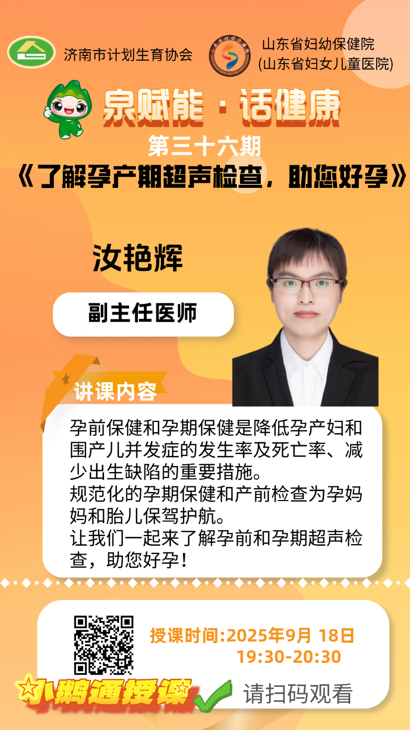 本期“泉赋能·话健康”直播课堂由山东省妇幼保健院副主任医师汝艳辉主讲,题目是《了解孕产期超声检查,助您好孕》,欢迎广大群众收听收看!
