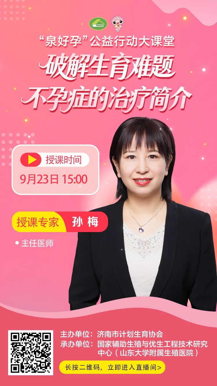 “泉好孕”第四期课堂由山东大学附属生殖医院主任医师孙梅主讲,题目是《破解生育难题 不孕症的治疗简介》,欢迎广大群众收听收看!