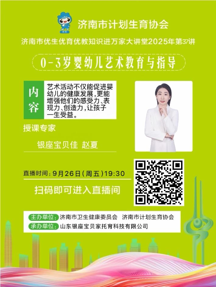9月26日(周五)19:30,济南市卫生健康委、计生协优生优育优教知识进万家2025年第37期“空中课堂”为大家安排了《0-3岁婴幼儿艺术教育与指导》专题讲座,邀请山东银座宝贝家托育科技有限公司专家赵夏主讲。