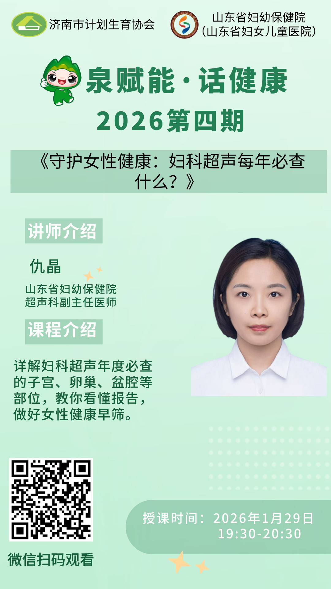 本期“泉赋能·话健康”直播课堂由山东省妇幼保健院超声科副主任医师仇晶主讲,题目是《守护女性健康:妇科超声每年必查什么?》,欢迎广大群众收听收看!