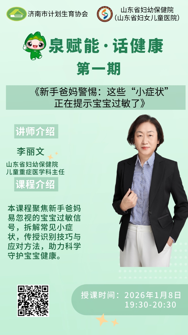 本期“泉赋能·话健康”直播课堂由山东省妇幼保健院儿童重症医学科主任李丽文主讲,题目是《这些“小症状”正在提示宝宝过敏了》,欢迎广大群众收听收看!