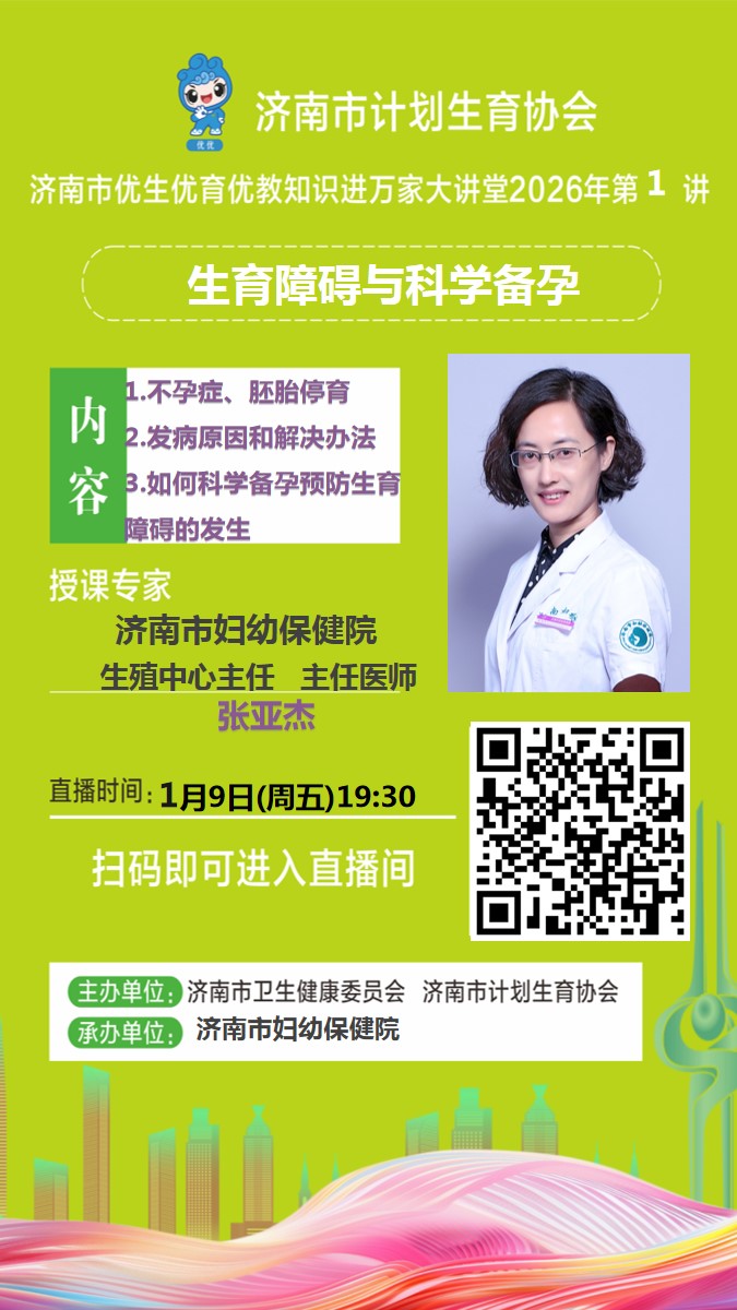 1月9日(周五)19:30,济南市卫生健康委、计生协优生优育优教知识进万家2026年第1期“空中课堂”为大家安排了《生育障碍与科学备孕》专题讲座,邀请济南市妇幼保健院生殖中心主任张亚杰主讲。