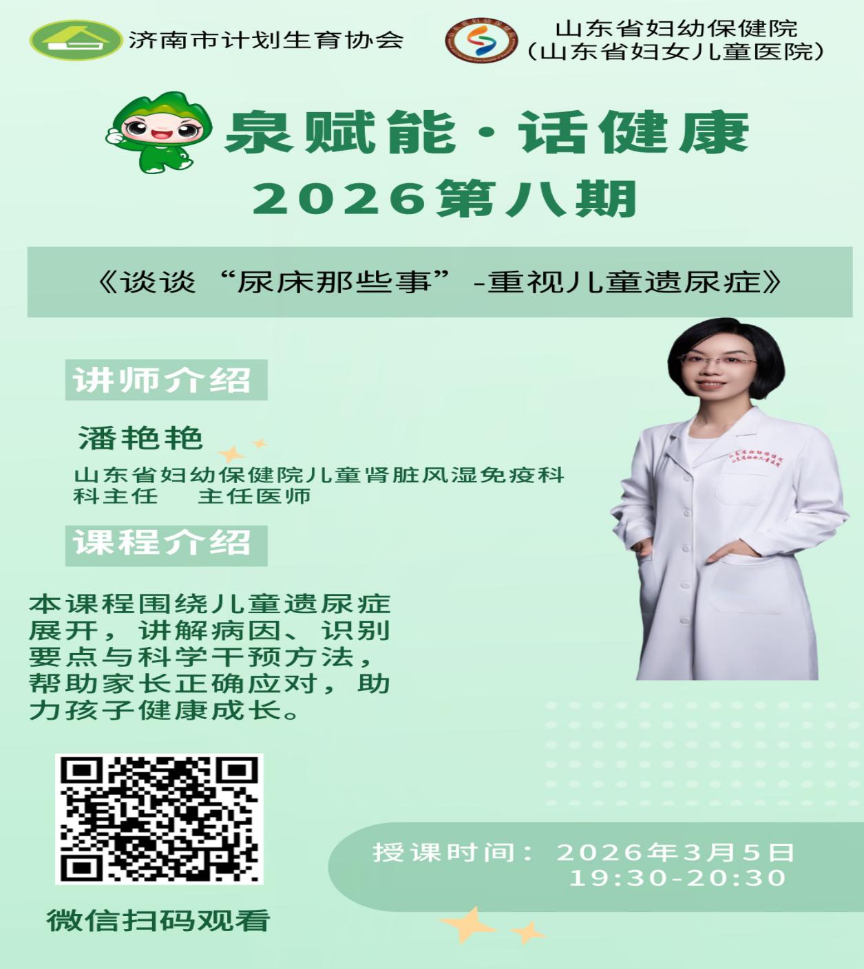 本期“泉赋能·话健康”直播课堂,由山东省妇幼保健院儿童肾脏风湿免疫科科主任 主任医师潘艳艳主讲,题目是《谈谈“尿床哪些事”-重视儿童遗尿症》,欢迎广大群众收听收看!