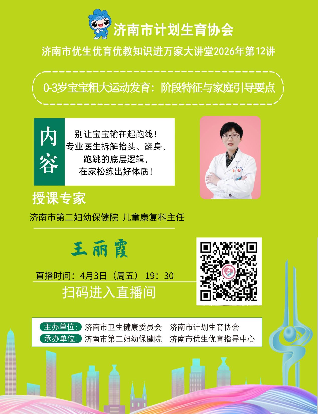 4月3日(周五)19:30,济南市卫生健康委、计生协优生优育优教知识进万家2026年第12期“空中课堂”为大家安排了《0-3岁宝宝粗大运动发育:阶段特征与家庭引导要点》专题讲座,邀请济南市第二妇幼保健院儿童康复科主任王丽霞主讲。