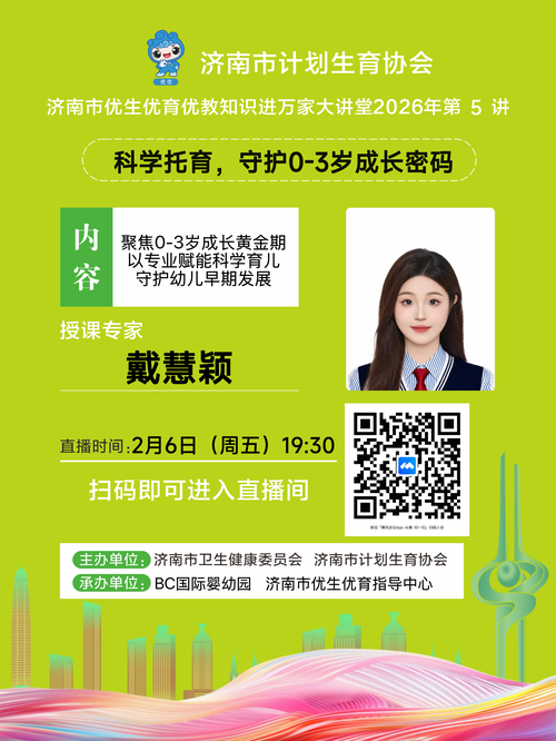 2月6日(周五)19:30,济南市卫生健康委、计生协优生优育优教知识进万家2026年第5期“空中课堂”为大家安排了《科学托育,守护0-3岁成长密码》专题讲座,邀请BC国际婴幼园戴慧颖主讲。
