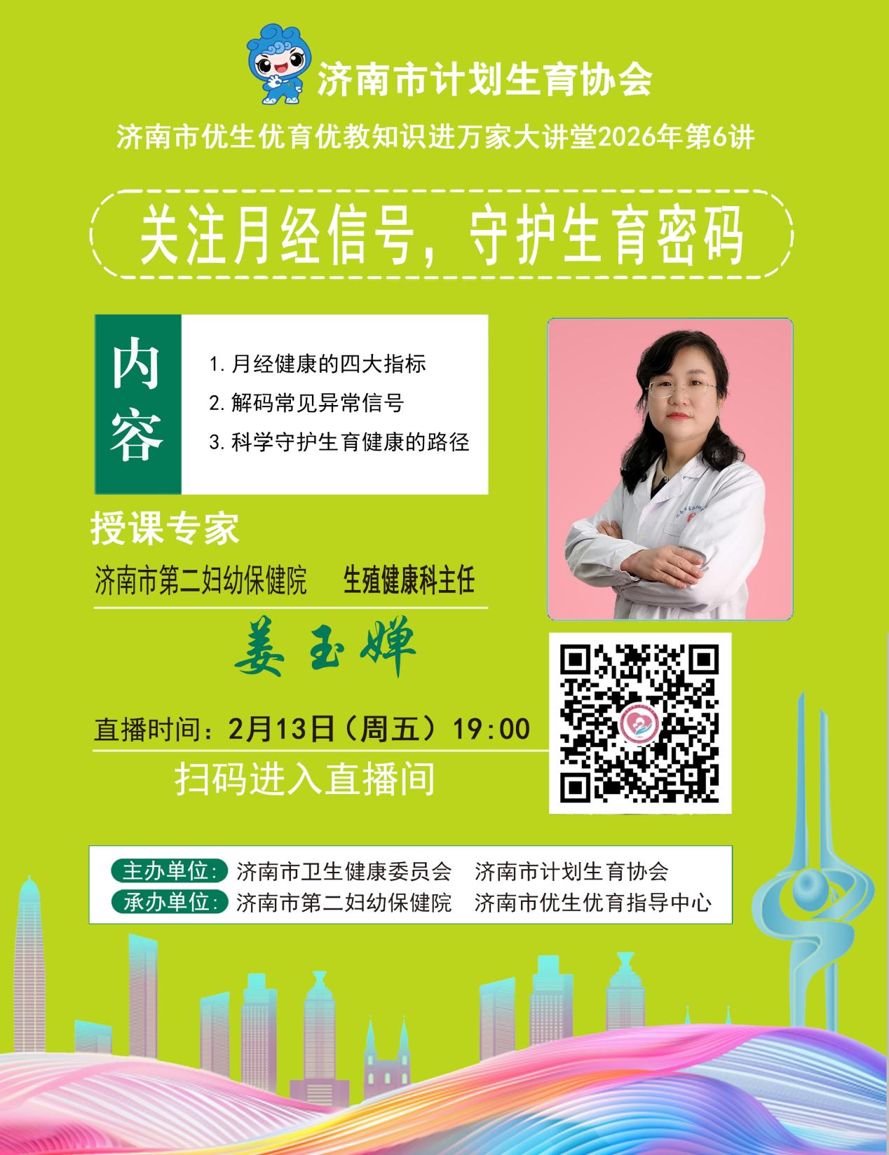 2月13日(周五)19:30,济南市卫生健康委、计生协优生优育优教知识进万家2026年第6期“空中课堂”为大家安排了《关注月经信号,守护生育健康》专题讲座,邀请济南市第二妇幼保健院主任医师姜玉婵主讲。
