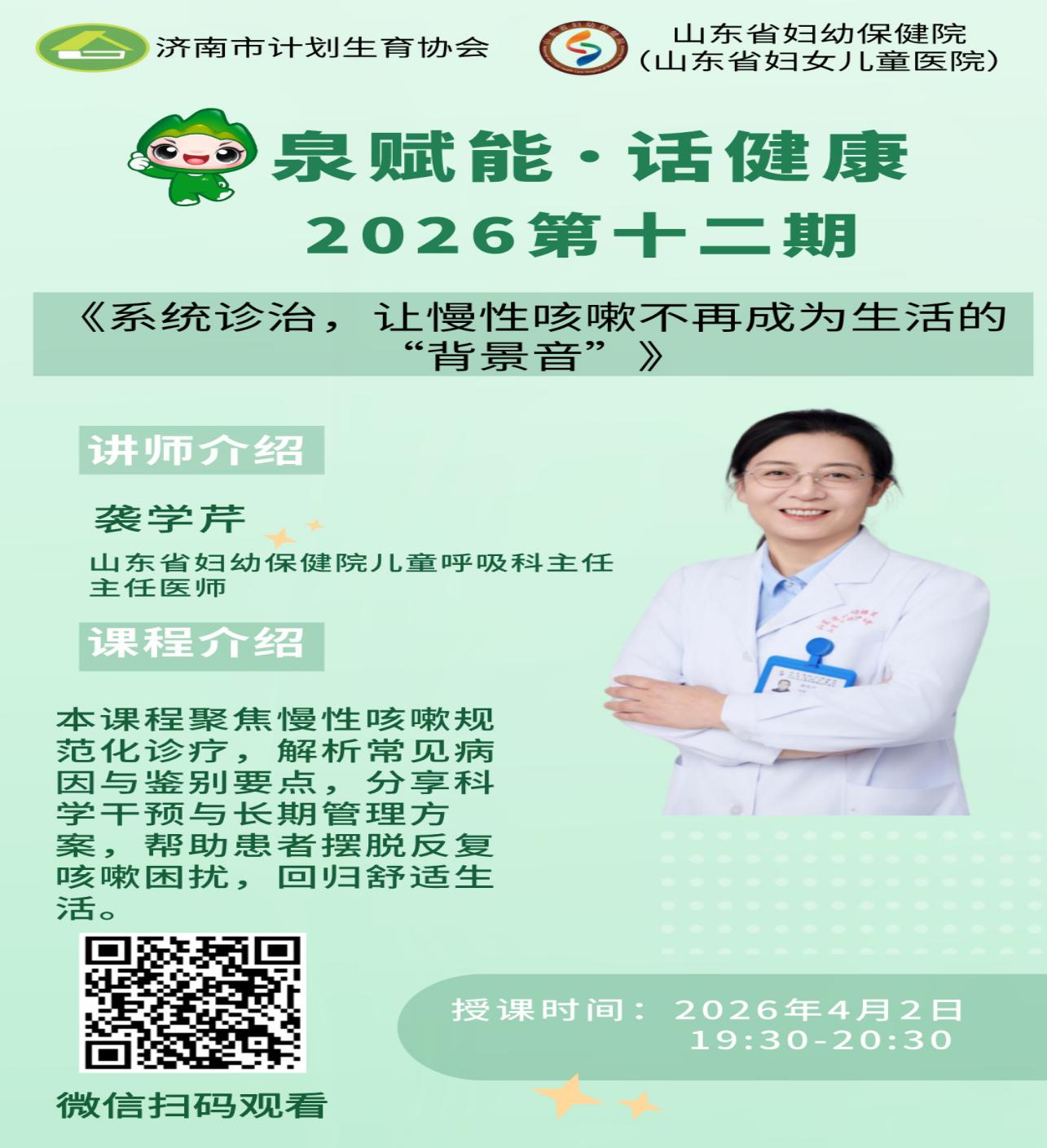 本期“泉赋能·话健康”直播课堂,由山东省妇幼保健院儿童呼吸科主任主任医师袭学芹主讲,题目是《系统诊治,让慢性咳嗽不再成为生活的“背景音”》,请各级计生协秘书长积极转发讲座海报,做好组织宣传工作。也请有需求的婴幼儿家长、广大群众收听收看!