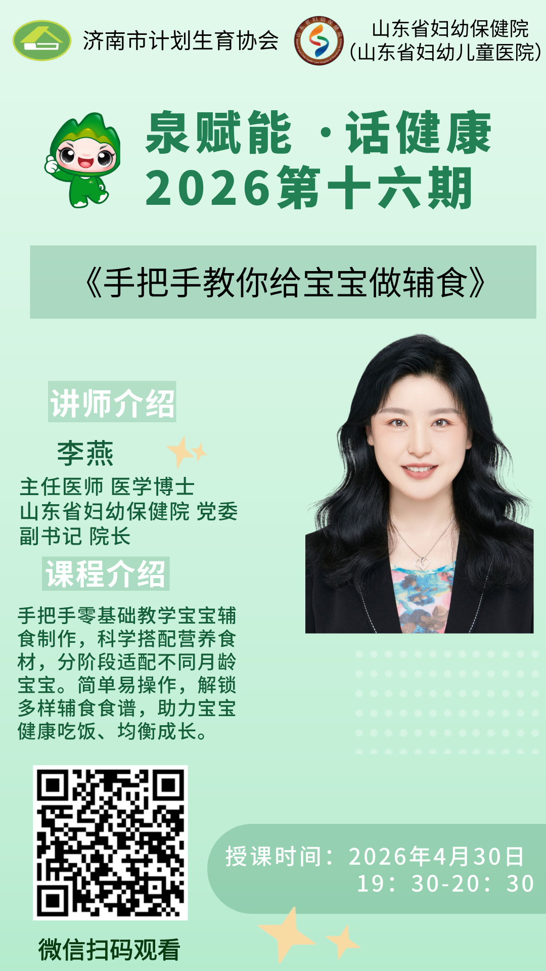 本期“泉赋能·话健康”直播课堂,由山东省妇幼保健院党委副书记、院长,主任医师、医学博士李燕主讲,题目是《手把手教你给宝宝做辅食》,欢迎广大群众收听收看!