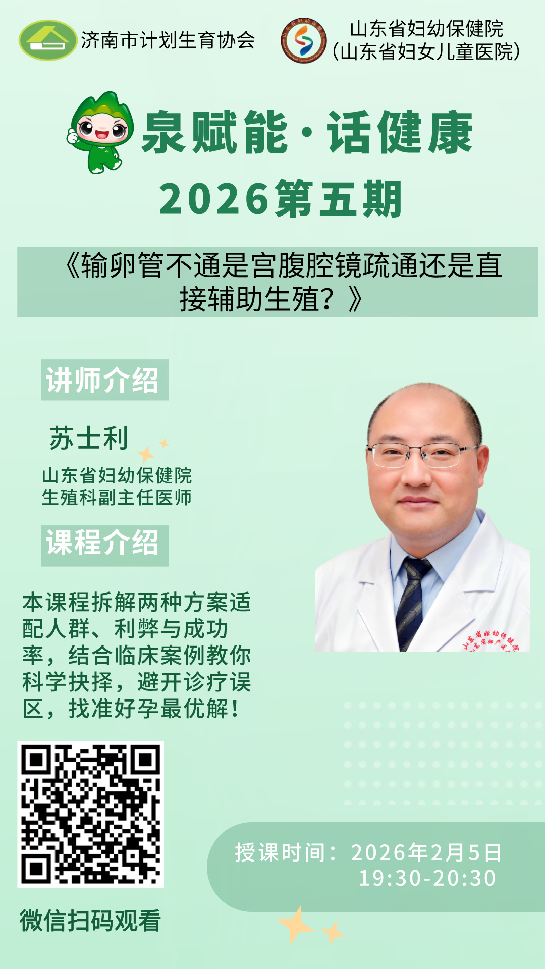 本期“泉赋能·话健康”直播课堂由山东省妇幼保健院生殖科副主任医师苏士利主讲,题目是《输卵管不通是宫腹腔镜疏通还是直接辅助生殖?》,欢迎广大群众收听收看!